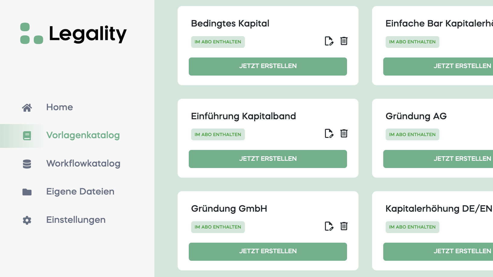 Von der Gründung bis hin zum komplexen Erbvertrag – jegliche Dokumente lassen sich mit Legality automatisiert in kürzester Zeit generieren. Dein gesamtes Know-How an Vertragsvorlagen an einem Ort.